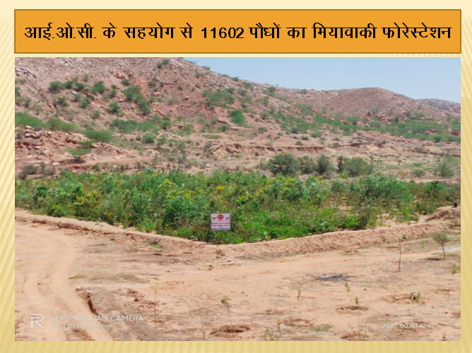 लगभग 10393 पौधे लगवाए गए यह प्लांटेशन का कार्य लगभग डेढ़ बीघा जमीन में को समतल करवा कर करवाया गया इसके अलावा मियावाकी प्लांटेशन में पानी की पूर्ति के लिए लगभग 550 से 600 फिट की गहराई का एक ट्यूबवेल भी आईओसीएल ओपनिंग द्वारा स्थापित करवाया गया, वर्तमान में 2000 पौधो का पौधारोपण किया जा रहा है।